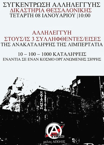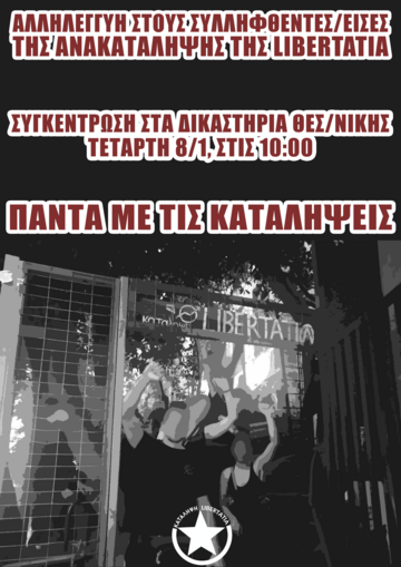 Καλούμε σε συγκέντρωση αλληλεγγύης στους/ις 3 συλληφθέντες/είσες συντρόφους/ίσσες της δεύτερης εκκένωσης της Κατάληψης Libertatia οι οποίοι δικάζονται την Τετάρτη 8 Γενάρη, στις 10:00 στα Δικαστήρια Θεσσαλονίκης.