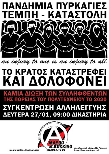 Απέναντι στη συνθήκη της γενικευμένης επίθεσης, λεηλασίας και καταστροφής, απαιτείται μια πλατιά κοινωνική κινητοποίηση, το ξεπέρασμα της ανάθεσης, της διαμεσολάβησης και της αδράνειας, το δυνάμωμα των κοινωνικών-ταξικών αγώνων, η συγκρότηση αυτοοργανωμένων, αντιθεσμικών μετώπων αντίστασης και η δημιουργία κάθε δυνατού αναχώματος σε κάθε σημείο που εκδηλώνεται η κρατική και καπιταλιστική βαρβαρότητα. Απέναντι στο δυστοπικό μέλλον που μας επιφυλάσσουν οι ελίτ της εξουσίας και του πλούτου, υπάρχει η επιλογή της συλλογικής αντίστασης και του αγώνα. Να τους θυμίσουμε τι μπορεί να συμβεί όταν η κοινωνία των εκμεταλλευόμενων και των καταπιεσμένων ανθρώπων παίρνει την κατάσταση στα χέρια της και αντιστέκεται μαζικά και μαχητικά στους σχεδιασμούς τους. Αν μένει κάτι ακόμα να σωθεί από τη φρίκη και τη βαρβαρότητα που μας καταδικάζει το κρατικό και καπιταλιστικό σύστημα, αυτό βρίσκεται στα δικά μας χέρια. Η μόνη λύση για έναν κόσμο ισότητας, αλληλεγγύης και ελευθερίας, για έναν κόσμο που η ζωή μας δεν θα παζαρεύεται και δεν θα εξαρτάται από τους υπολογισμούς των κυρίαρχων, για έναν κόσμο χωρίς πολέμους, φτώχεια, λεηλασία της φύσης, ξεριζωμό, αρρώστιες και θάνατο είναι η ΚΟΙΝΩΝΙΚΗ ΕΠΑΝΑΣΤΑΣΗ.