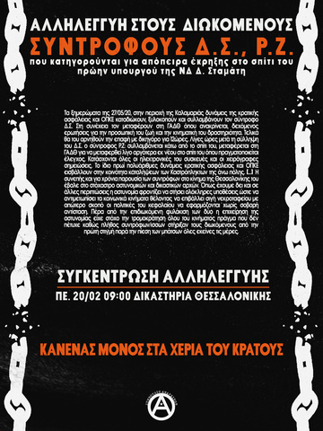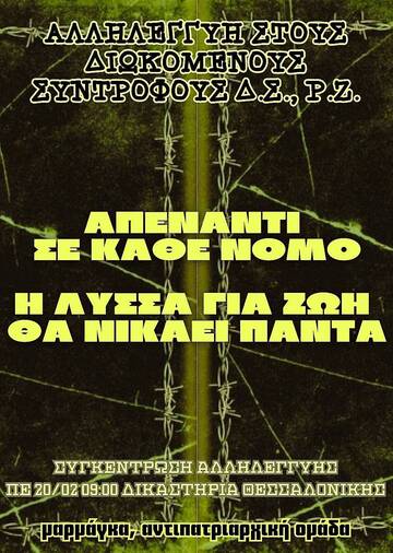 [20/2, 9.30 Δικαστήρια Θεσσαλονίκης] Συγκέντρωση σε αλληλεγγύη με τους συντρόφους Δ.Σ. και Ρ.Ζ. - Ημέρα απόφασης