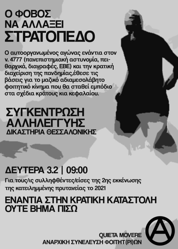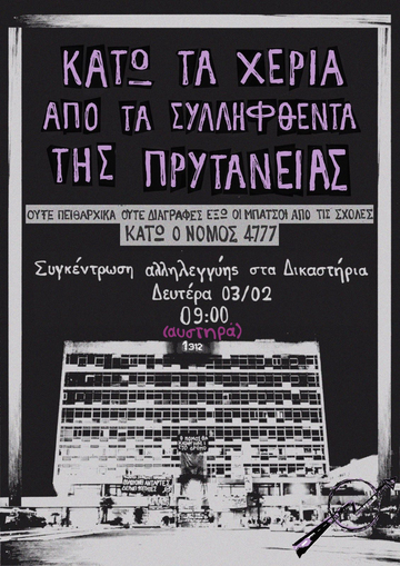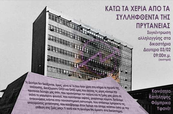 Δευτέρα 3/02 - 9:00 συγκέντρωση αλληλεγγύης για τους/ις συλληφθέντες/εισες της 2ης εκκένωσης της κατειλημμένης πρυτανείας στα δικαστήρια Θεσσαλονίκης