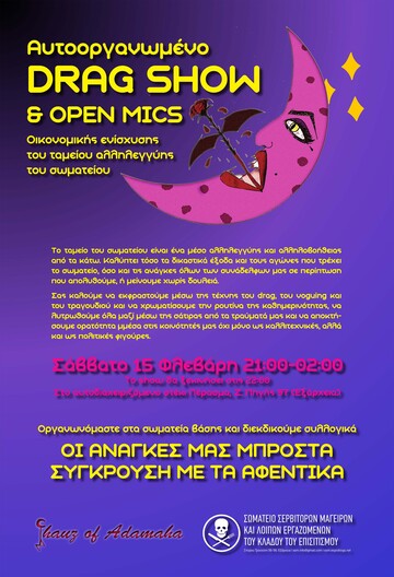 Το Σάββατο 15/2 21:00- 02:00 σας καλούμε στο αυτοοργανωμέο Drag show+open mics για την οικονομική ενίσχυση του ταμείου αλληλεγγύης του Σωματείου Σερβιτόρων Μαγείρων και λοιπών εργαζομένων του κλάδου του επισιτισμού.