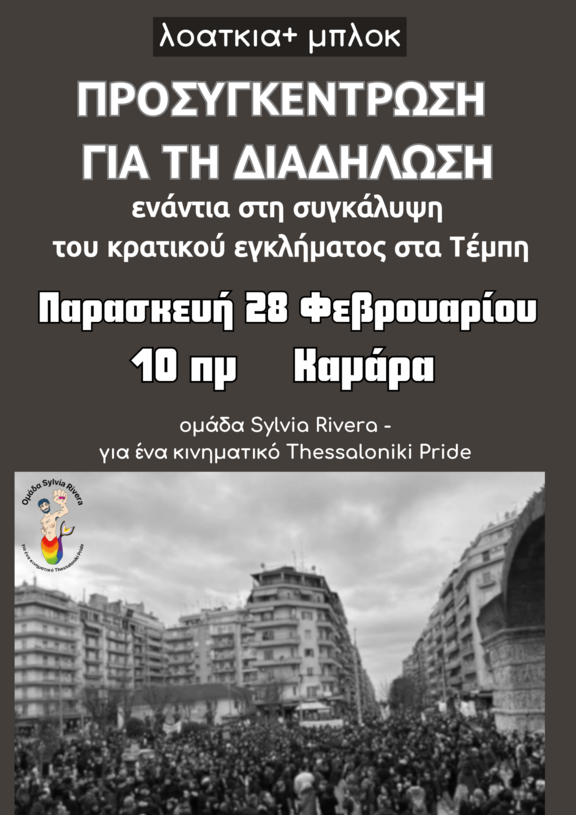 Το κρατικό έγκλημα στα Τέμπη και όσα ακολούθησαν μας αφορούν όλες, όλα και όλους μας. Καλούμε σε συγκρότηση λοατκια+ μπλοκ στην προσυγκέντρωση στην Καμάρα στις 10πμ για τη μεγάλη απεργιακή διαδήλωση της Παρασκευής 28 Φεβρουαρίου. Δύο χρόνια μετά το έγκλημα, η ασφάλεια των σιδηροδρόμων παραμένει ζητούμενο, ενώ οι χειρισμοί που έγιναν για την αναζήτηση των αιτιών της έκρηξης και της πυρκαγιάς μυρίζουν συγκάλυψη.