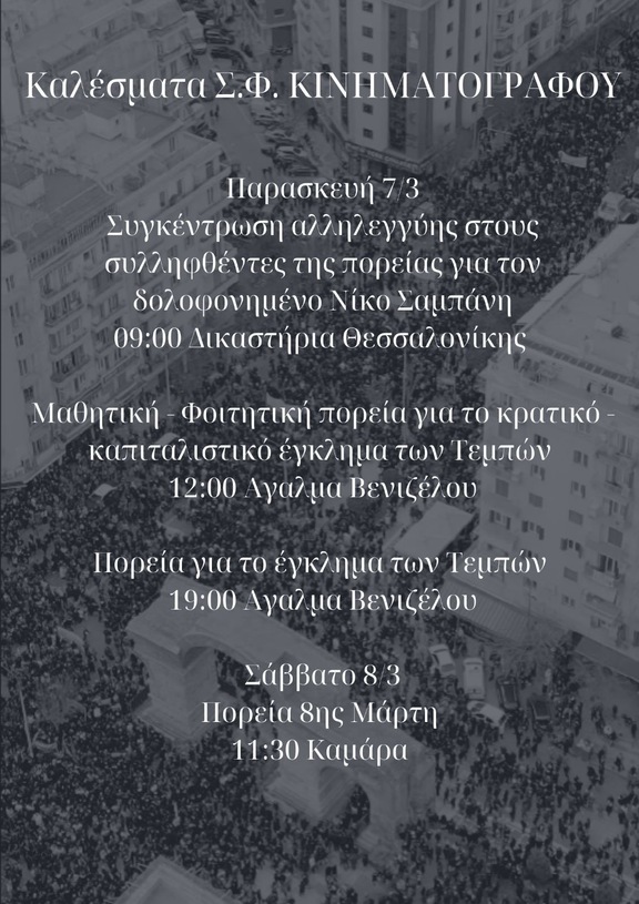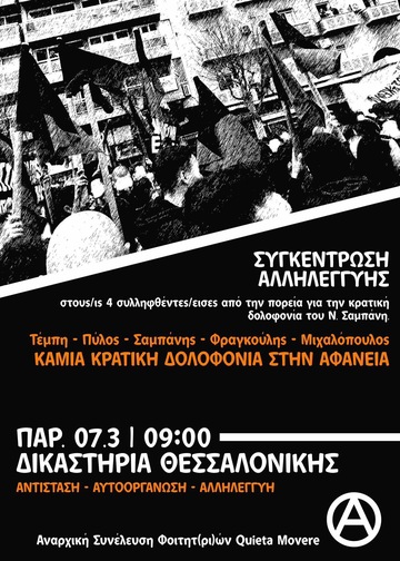 ΣΥΓΚΕΝΤΡΩΣΗ ΑΛΛΗΛΕΓΓΎΗΣ ΣΤΑ 4 ΣΥΛΛΕΙΦΘΕΝΤΑ ΑΤΟΜΑ ΤΗΣ ΠΟΡΕΙΑΣ ΣΤΙΣ 23/10 ΕΝΑΝΤΙΑ ΣΤΗΝ ΚΡΑΤΙΚΗ ΔΟΛΟΦΟΝΙΑ ΤΟΥ ΝΙΚΟΥ ΣΑΜΠΑΝΗ ΠΑΡΑΣΚΕΥΗ 6/03 - 9π.μ. ΔΙΚΑΣΤΙΚΌ ΜΈΓΑΡΟ ΘΕΣΣΑΛΟΝΊΚΗΣ