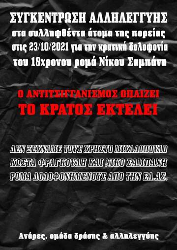 Στις 22/10/2021 πραγματοποιείται καταδίωξη ενός κλεμμένου οχήματος με 3 επιβάτες από πολλές δυνάμεις την Ελληνικής Αστυνομίας. Το όχημα ενώ ακινητοποιείται, οι μπάτσοι πυροβολούν και σκοτώνουν εν ψυχρώ (ρίχνοντας 38 σφαίρες!) τον ρομά Νίκο Σαμπάνη. Την επόμενη μέρα 23/10/21 καλείται πορεία οργής ενάντια στο κράτος-δολοφόνο και τον ρατσισμό που οπλίζει το χέρι κάθε μπάτσου, φασίστα αλλά δυνητικά και κάποιων "φιλήσυχων" πολιτών. Η μάζα κόσμου κατά την διάρκεια της πορείας έρχεται σε σύγκρουση με τους μπάτσους, οι οποίοι πραγματοποιούν συλλήψεις στον σωρό.