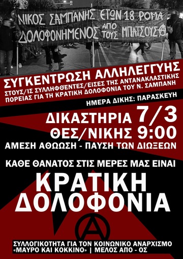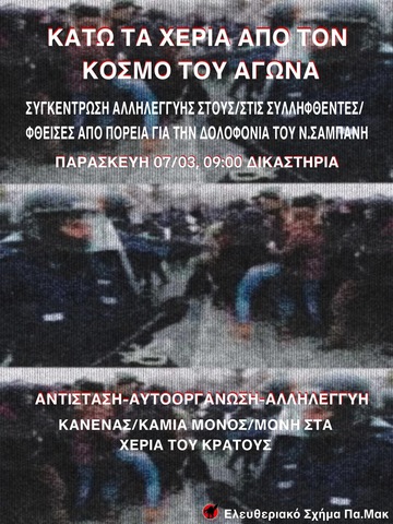 Συγκέντρωση αλληλεγγύης στους συλληφθέντες/φθεισες από πορεία για την δολοφονία του Ν. Σαμπάνη στα δικαστήρια, Παρασκευή 7/3, 9:00 .
