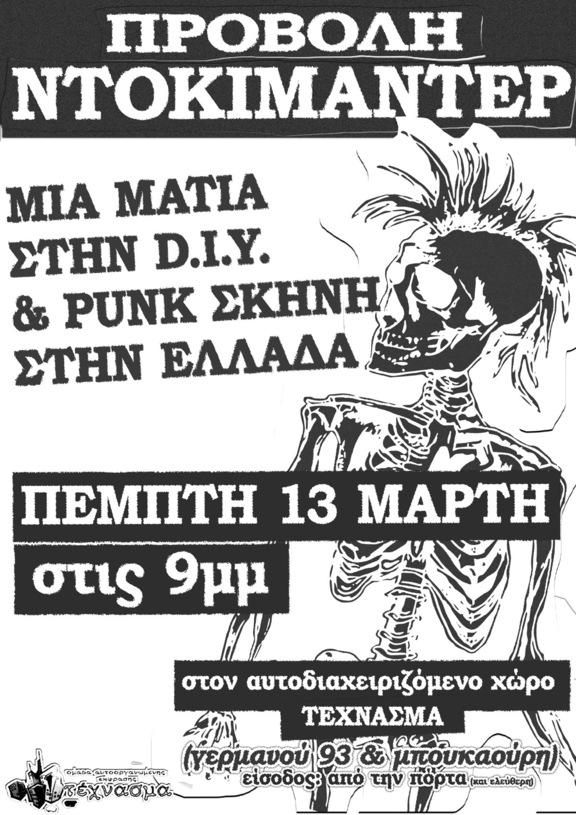 προβολή του ντοκιμαντέρ «Μια ματιά στην Punk και diy σκηνή στην ελλάδα» την πέμπτη 13 μάρτη…