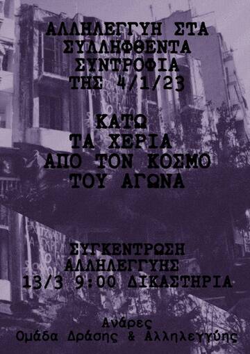 Συγκέντρωση αλληλεγγύης στα συλληφθέντα συντροφια από την ανακατάληψη της Terra incognita , 13/3, 9:00 Δικαστήρια
