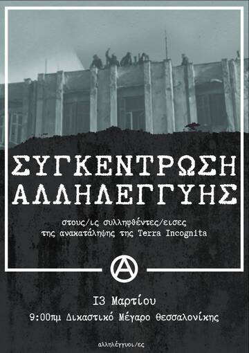 Συγκέντρωση αλληλεγγύης στα συλληφθέντα από την ανακατάληψη της Terra incognita , 13/3, 9:00 Δικαστήρια Θεσσαλονίκης