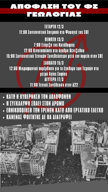 Με αφετηρία τις 28/2 ξαναπιάνουμε το νήμα και του περσινού φοιτητικού κινήματος! Ένα χρόνο μετά το μεγαλειώδες περσινό φοιτητικό κίνημα απέναντι στο νόμο Πιερρακάκη για τα ιδιωτικά πανεπιστήμια έχουμε την δυνατότητα να αναπτύξουμε έναν νικηφόρο αγώνα απέναντι στην κυβέρνηση. Να αξιοποιήσουμε τις περσινές πολύτιμες εμπειρίες για να διεξάγουμε έναν αγώνα που αυτή τη φορά δεν θα μείνει στην μέση, αλλά αποφασιστικά θα φτάσει ΜΕΧΡΙ ΤΕΛΟΥΣ. Να προετοιμάσουμε το επόμενο μεγάλο αγωνιστικό ραντεβού. Να στήσουμε τα θεμέλιά αυτού του αγώνα μέσα από δημοκρατικές. διαδικασίες, γενικές συνελεύσεις, επιτροπές και συντονιστικά. Με μαχητικά μέσα πάλης, εβδομαδιαίες διαδηλώσεις, κλιμάκωση με καταλήψεις. Να βάλουμε το μαχαίρι στο κόκαλο, στοχεύοντας καθαρά στο σταμάτημα των ιδιωτικοποιήσεων και την τιμωρία του καθεστώτος Μητσοτάκη: ΚΑΤΩ Η ΚΥΒΕΡΝΗΣΗ - ΤΑ ΤΡΕΝΑ ΤΩΡΑ ΠΙΣΩ ΣΤΟ ΔΗΜΟΣΙΟ!