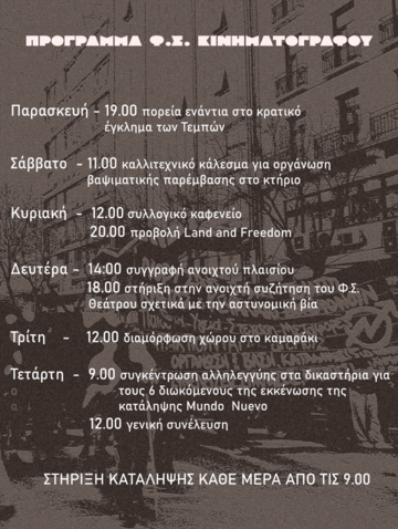 Για εμάς οι καταλήψεις ήταν,είναι και θα είναι μέρη συσπείρωσης των κοινωνικών και των ταξικών αγώνων κόντρα στον κόσμο του σύγχρονου ολοκληρωτισμού. Μέρη όπου αποτελούν πρόπλασμα του νέου κόσμου τον οποίον χτίζουμε,σε άρνηση με την εξαθλίωση και τον θάνατο που συνεχώς μας επιβάλλουν. Έναν νέο κόσμο ισότητας,αλληλεγγύης και ελευθερίας,τον κόσμο της αναρχίας και του ελευθεριακού κομμουνισμού.