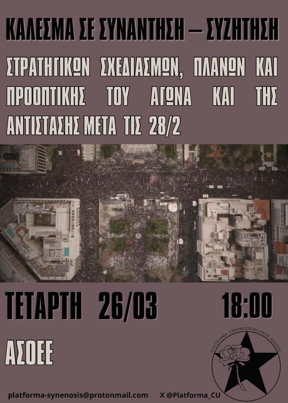 Πιστεύουμε πως όλα τα επιμέρους κομμάτια που αντιλαμβανόμαστε τον εαυτό τους μέρος αυτής της συλλογικής προσπάθειας καθώς και της προοπτικής που αυτή φέρει, οφείλουμε να συναντηθούμε εκ νέου και να συζητήσουμε για την προοπτική της διευρυμένης οργάνωσης του αγώνα όλης της επόμενης περιόδου και του εδάφους που ανοίγεται μπροστά μας μετά την μαζική μαχητική κινητοποίηση της 28ης Φλεβάρη αλλά και τον κινητοποιήσεων που ακολούθησαν. Θεωρούμε αναγκαία και προωθητική την κατάθεση πολιτικών σκεπτικών, σχεδιασμών, πλάνων, προτάσεων, ενημερώσεων και προβληματισμών.