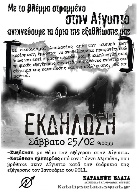 Εκδήλωση - συζήτηση για την εξέγερση στην Αίγυπτο με τον Γ. Αλμπάνη που έζησε από κοντά την εξέγερση τον περασμένο χρόνο, αυτό το Σάββατο 25/2, στις 21.00.