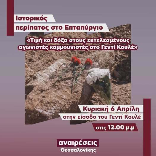 Ως Λέσχη Αναιρέσεις συμμετέχουμε στον ιστορικό περίπατο στο κολαστήριο του Γεντί Κουλέ και το χώρο των ομαδικών τάφων. Η ιστορική μνήμη είναι εφόδιο μας για τις σύγχρονες μάχες, ενάντια στα σημερινά εγκλήματα του αστικού κράτους και των καπιταλιστών, αλλά και ενάντια στην παρουσία των φασιστοειδών, που προσβάλλουν και αμαυρώνουν την ιστορία της πόλης.