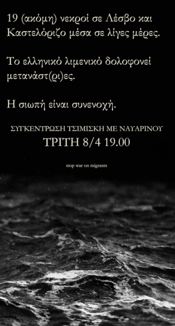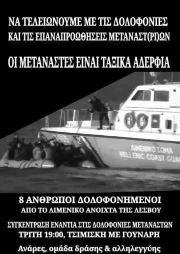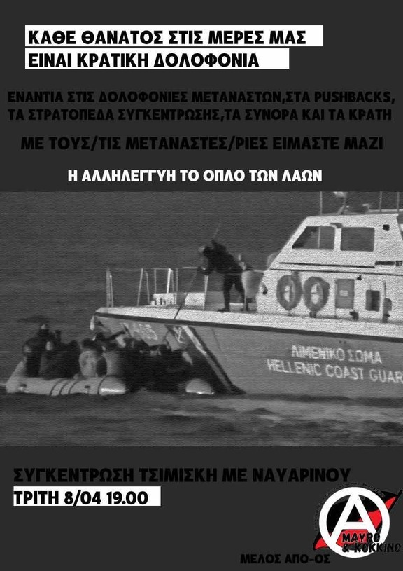 Όσοι άνθρωποι επιχειρούν να διασχίσουν το Αιγαίο για να ζήσουν μια καλύτερη ζωή, κινδυνεύουν να σκοτωθούν από τις ελληνικές αρχές ή στην καλύτερη περίπτωση να επαναπροωθηθούν βίαια στο όνομα της ασφάλειας, της τάξης και του κέρδους. Σε μία περίοδο όπου οι πόλεμοι του κεφαλαίου οδηγούν σε γενοκτονία, εκατόμβες νεκρών, ανθρωπιστικές κρίσεις, στο εσωτερικό των δυτικών κρατών καλπάζει η αντιμεταναστευτική ρητορική που ανάγει τους μετανάστες ως την πηγή των δεινών, κλείνοντας το μάτι στη θωράκιση του κεφαλαίου.