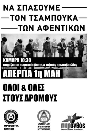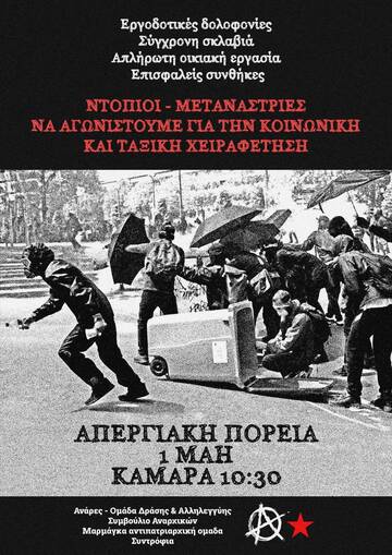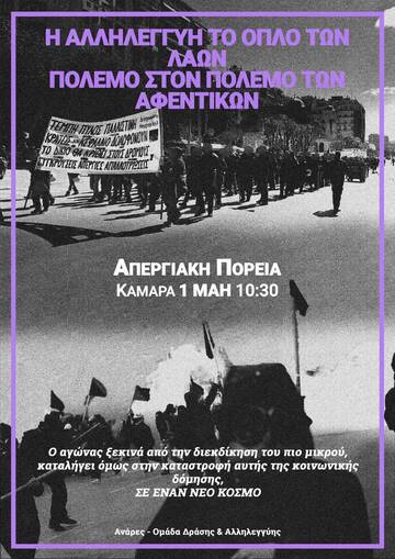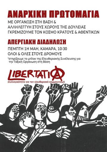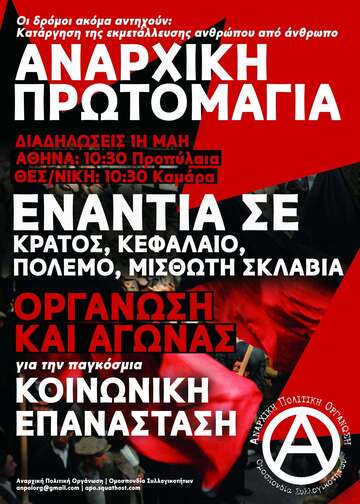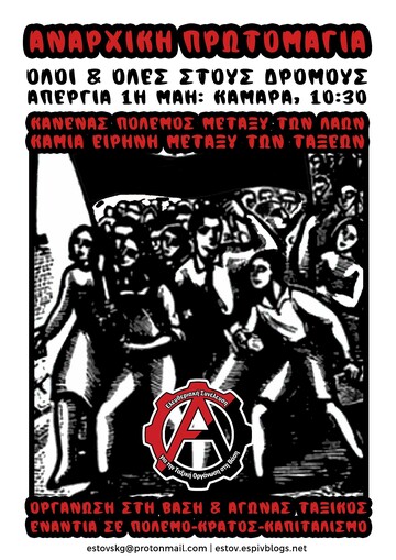 Η στήριξη και η συμμετοχή στις φετινές απεργιακές διαδηλώσεις της Εργατικής Πρωτομαγιάς είναι κομβικής σημασίας για τους αγώνες της εργατικής τάξης. Οφείλουμε να δώσουμε ένα μήνυμα αντίστασης απέναντι στο κράτος και το κεφάλαιο, απέναντι στα αφεντικά και το πολιτικό τους προσωπικό: τους υπεύθυνους για την καθημερινή καταπίεση, εκμετάλλευση και εξαθλίωση που βιώνουμε. Βασιζόμενοι/ες στην αυτοοργάνωση, την ταξική αλληλεγγύη και την πίστη στην απελευθερωτική υπόθεση της κοινωνικής επανάστασης να έρθουμε σε ρήξη με τα αστικά κόμματα, την ψευδαίσθηση της αστικής «δημοκρατίας» και τον αστικοποιημένο/γραφειοκρατικό συνδικαλισμό, που αποτελούν ταφόπλακα για τους αγώνες μας. Επιτακτικό καθήκον της εποχής μας είναι η συγκρότηση ενός ακηδεμόνευτου, ταξικού, αντιπολεμικού, διεθνιστικού κινήματος που θα μπορέσει αφενός να πετύχει σημαντικές νίκες, μερικού χαρακτήρα, στην κατεύθυνση της ικανοποίησης των εργατικών συμφερόντων και των κοινωνικών αναγκών, στο σήμερα, αφετέρου να θέσει τους κατάλληλους όρους σύγκρουσης και επαναστατικής ανατροπής του κράτους και του κεφαλαίου, για τη συλλογική οικοδόμηση της κοινωνίας του ελευθεριακού κομμουνισμού.