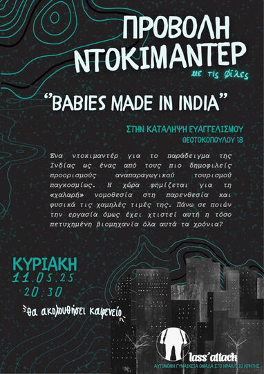 Το παράδειγμα της Ινδίας δεν είναι μια τραβηγμένη ιστορία από τη μακρινή Ασία. Έχει τρομαχτικές ομοιότητες με το κύκλωμα εμπορίας βρεφών και γυναικών στη Κρήτη, μια υπόθεση που είδε το φως της διασημότητας τα τελευταία χρόνια. Διάσημοι και εξειδικευμένοι γιατροί σε νέες τεχνολογίες μαζί με άλλους διαμεσολαβητές και με το κράτος να κάνει τα στραβά μάτια σχηματίζουν ένα αναπτυσσόμενο κερδοφόρο κύκλωμα που ελέγχει από την αρχή μέχρι το τέλος την αναπαραγωγική μας εργασία. Κλειδί για την επιτυχία και του κυκλώματος της Κρήτης ήταν φυσικά η φθηνή μαύρη εργασία μεταναστριών.