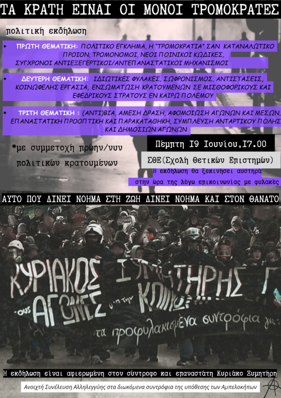 Αυτή την εκδήλωση την αφιερώνουμε στον συνεπή αναρχικό αγωνιστή και σύντροφο ΚΥΡΙΑΚΟ ΞΥΜΗΤΗΡΗ, ο οποίος έδωσε την ζωή του στον επαναστατικό αγώνα. Την μνήμη του οφείλουμε να την διατηρήσουμε ζωντανή και ακέραιη καθώς και να τον κρατήσουμε παρόντα στα διάφορα πεδία αγώνα, μέχρι την κατάργηση της κρατικής/καπιταλιστικής κυριαρχίας.