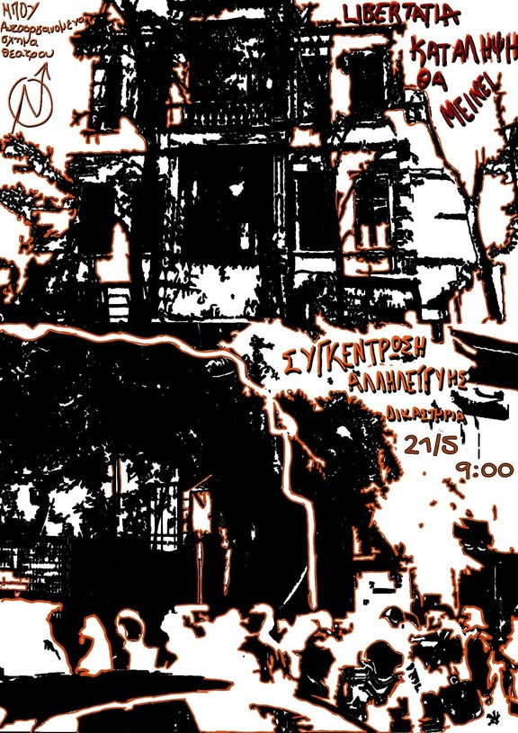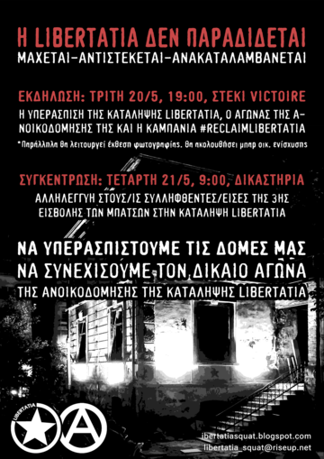 Την Τετάρτη 21/05 εκδικάζεται η περίπτωση ανοικοδόμησης της Libertatia όπου συνελήφθησαν σύντροφοι και συντρόφισσες κατά τη διάρκεια εργασιών αποκατάστασης του κτηρίου μετά τον εμπρησμό του από φασίστες κατά τη διάρκεια μακεδονικού συλλαλητηρίου. Οι κατηγορίες με τις οποίες βρίσκονται αντιμέτωποι είναι αυτές της φθοράς μνημείου, της παράνομης δόμησης και της απείθειας. Κατηγορίες οι οποίες δεν μπορούν παρά να μας φαίνονται γελοίες, καθώς γνωρίζουμε πως προσάπτονται κατά το δοκούν. Αν το κράτος κοπτόταν για το μνημείο, γιατί δεν σταμάτησε τον εμπρησμό; Γιατί δεν έψαξε ποτέ να βρει τους υπαίτιους για αυτόν; Γιατί φορτώνει κατηγορίες μόνο στα υποκείμενα που επιλέγουν συλλογικά να αναδομούν τους αυτοοργανωμένους χώρους τους όταν χτυπιούνται; Μπορεί κάτι τέτοιο αρχικά να φαντάζει με αντίφαση, αλλά γνωρίζουμε πως στην πραγματικότητα το κράτος εντείνει την καταστολή και την πειθάρχησή του, απέναντι σε όσα άτομα επιδιώκουν να ζήσουν και να αλλάξουν τις ζωές τους με συλλογικούς τρόπους. Φροντίζει να επιτίθεται όλο και πιο έντονα σε κάθε αυτόνομη-αντιθεσμική δράση η οποία δεν φαίνεται να χωράει στα στενά πλαίσια της δημοκρατικής νομιμότητας. Και προσπαθεί πολύ να μας πείσει πως η μόνη κανονικότητα θα είναι η νομιμότητα, όταν βέβαια και η ίδια η αστική δικαιοσύνη προσφέρεται με συγκεκριμένους όρους και εξυπηρετεί συγκεκριμένα συμφέροντα (τα οποία δεν είναι τα δικά μας).
