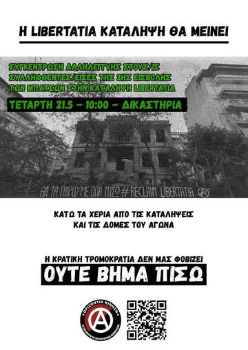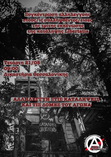 Την Τετάρτη 21/5 πραγματοποιείται η εκδίκαση για την 3η εισβολή στην κατάληψη Libertatia στην οποία 12 συντρόφοι/ισσες συνελήφθησαν κατά την διάρκεια εργασιών στα πλαίσια ανοικοδόμησης μέρος της κατάληψης,έπειτα της εμπρηστικής επίθεσης από φασιστικές ομάδες το 2018.
