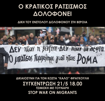 5 Δεκέμβρη 2022: O 16χρονος Ρομά Κώστας -Κάλο- Φραγκούλης έφυγε από βενζινάδικο χωρίς να πληρώσει 20 ευρώ για τα καύσιμα που έβαλε. Ακολούθησε η καταδίωξή του από μπάτσους που γνώριζαν πως στο αυτοκίνητο επέβαινε Ρομά. Ο Κάλο πυροβολήθηκε στο κεφάλι. Το πρωί της επόμενης μέρας, 6 Δεκέμβρη 2022, σε συγκέντρωση μπροστά στα δικαστήρια Θεσσαλονίκης, τα ΜΑΤ χτύπησαν και σώριασαν στο έδαφος τον πατέρα του Κάλο. Μια βδομάδα μετά ανακοινώθηκε και τυπικά ο θάνατoς του Κάλο. Ο δολοφόνος μπάτσος κυκλοφορεί ελεύθερος.