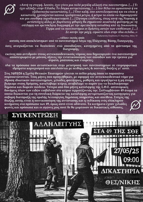 Την Τρίτη 27/05 δεν δικάζονται απλά οι 49 συμφοιτήτριες μας. Δικάζονται οι αγώνες για την ελεύθερη και δωρεάν πρόσβαση στην παιδεία για τους μη προνομιούχους. Δικάζονται οι ταξικοί αγώνες των φοιτητριών μέσα από οριζόντιες και συλλογικές διαδικασίες και επιχειρείται να ποινικοποιηθούν μέσα όπως οι γενικές συνελεύσεις και οι καταλήψεις συλλόγων. Καλούμε, την Τρίτη 27/05, στις 9:00, σε συγκέντρωση αλληλεγγύης με τους 49 συμφοιτήτριες/ες μας. Για να δείξουμε και έμπρακτα μέσα από την αλληλεγγύη μας ότι ο αγώνας απέναντι στην εκπαίδευτικη αναδιάρθρωση και στην υποτίμηση των ζώων μας συνεχίζεται και τίποτα δεν έχει τελειώσει.