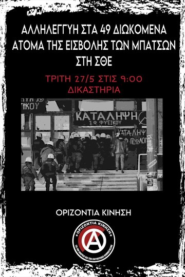 Στις 27/5 έχει οριστεί η δική των 49 συλληφθέντων/είσων έπειτα απο την εκκένωση της κατάληψης της ΣΘΕ. Στις πλάτες τους έχει χτιστεί δικογραφία που θέλει να τους καταλογίσει ολόκληρο το φοιτητικό κίνημα που άνθισε τη δίμηνη περίοδο που προηγούνταν.