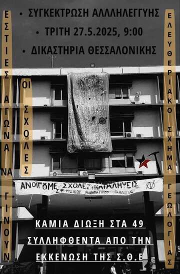 Στις 27 Μαϊου είναι δίκη των 49 συλληφθέντων από την εκκένωση της κατειλημμένης σχολής θετικών επιστημών του ΑΠΘ στις 16/3/2024. Τα συλληφθέντα κατηγορούνται από την εισαγγελική αρχή για την διατάραξη της λειτουργίας δημόσιας υπηρεσίας για όλη την διάρκεια της δίμηνης κατάληψης κατά την περίοδο του φοιτητικού κινήματος ενάντια στα ιδιωτικά πανεπιστήμια.