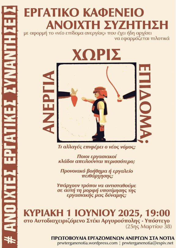 H επόμενη ανοιχτή συνέλευση θα πραγματοποιηθεί τη Δευτέρα 2/6/25 στις 20:00, στο Υπόστεγο - Αυτοδιαχειριζόμενο Στέκι Αργυρούπολης (25ης Μαρτίου 38, Αργυρούπολη).