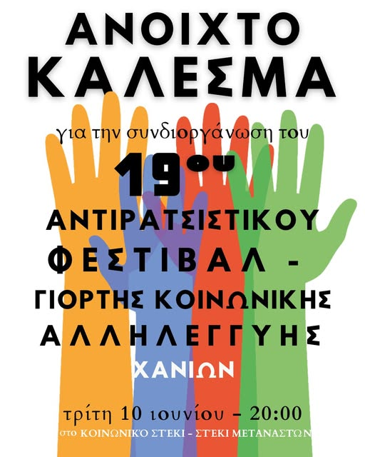 Καλούμε κόσμο ενδιαφερόμενο την Τρίτη 10 Ιουνίου για να αρχίσουμε να διοργανώνουμε το φετινό Αντιρατσιστικό Φεστιβάλ - Γιορτή Κοινωνικής Αλληλεγγύης Χανίων!