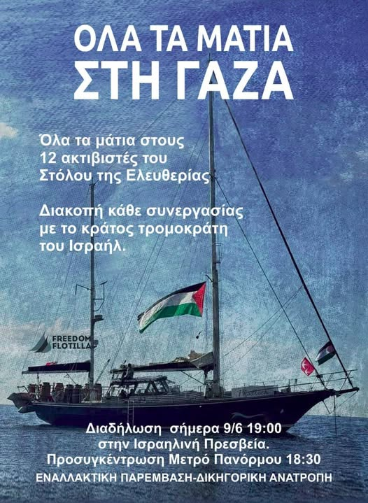 Όλοι/ες στη σημερινή συγκέντρωση στην ισραηλινή πρεσβεία σε αλληλεγγύη με τους συλληφθέντες και συλληφθείσες του ιστιοφόρου του στόλου ελευθερίας "Madleen".