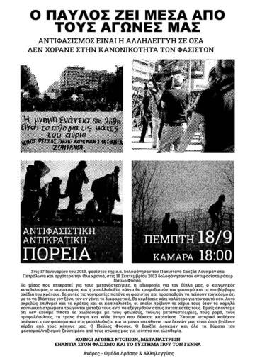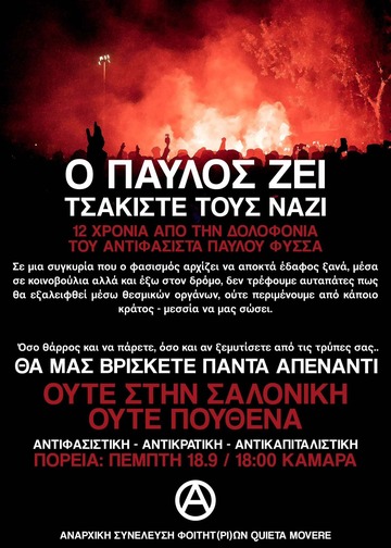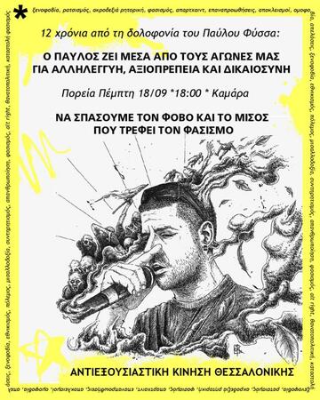 Κάλεσμα στην αντιφασιστική/αντικρατική πορεία με αφορμή την συμπλήρωση 12 χρόνων από την δολοφονία του αντιφασίστα ράπερ Παύλου Φύσσα