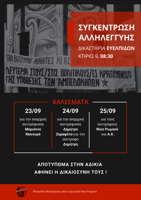 Συγκέντρωση αλληλεγγύης στις 23, 24 & 25 Σεπτεμβρίου, στις 8:30πμ, στα δικαστήρια της πρώην σχολής Ευελπίδων,