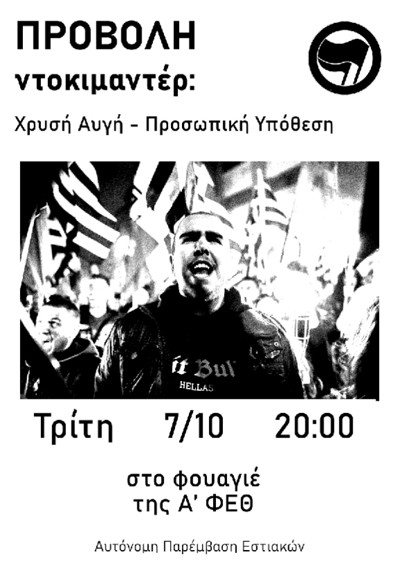 Προβολή του ντοκιμαντέρ 'Χρυσή Αυγή- Προσωπική Υπόθεση' και συζήτηση στις 20.00 στο Φουαγιέ της Α ΦΕΘ.