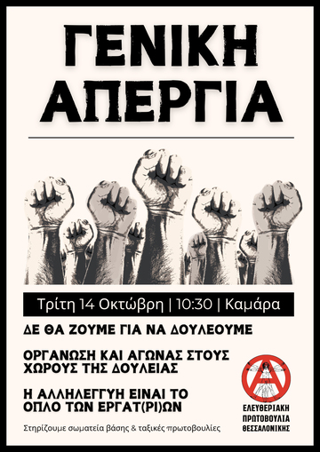 Η γενική απεργία στις 14 Οκτωβρίου αποτελεί ένα σημαντικό σταθμό, για να υψώσουμε τις φωνές μας και να διεκδικήσουμε αυξήσεις στους μισθούς, συλλογικές συμβάσεις και μείωση των ωρών εργασίας, ενάντια στο δυσβάστακτο κόστος ζωής που επιβάλλουν τα αφεντικά και το κράτος. Να θέσουμε, επίσης, στο προσκήνιο των διεκδικήσεών μας την υπεράσπιση του αναφαίρετου κοινωνικού δικαιώματος στη στέγαση, την υπεράσπιση της δημόσιας και δωρεάν υγείας και παιδείας που γίνονται βορά των ιδιωτικοποιήσεων με τα απογευματινά χειρουργεία (επί της ουσίας νομιμοποίηση στο φακελάκι) και την επικείμενη ίδρυση ιδιωτικών ΑΕΙ αντίστοιχα.