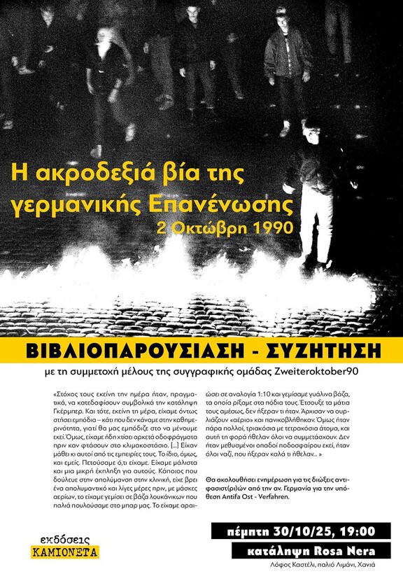 Βιβλιοπαρουσίαση/Συζήτηση :«Η ακροδεξιά βία της γερμανικής Επανένωσης - 2 Οκτώβρη 1990» από τις εκδόσεις Καμιονέτα, με τη συμμετοχή ενός εκ των συντελεστών της πρωτότυπης γερμανικής έκδοσης.