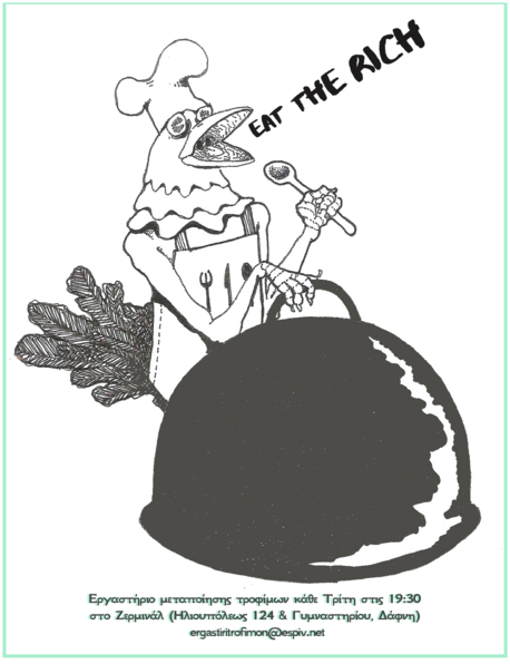 Κάθε Τρίτη στις 20:00, ανοίγουμε το εργαστήριο μεταποίησης τροφίμων. Το εργαστήριο μεταποίησης τροφίμων φιλοδοξεί να ασχοληθεί με θέματα που σχετίζονται με την παραγωγή και μεταποίηση της τροφής, με την συλλογική κάλυψη υλικών αναγκών και επιθυμιών, με ζητήματα συνεργατικής, κοινοτικής παραγωγής και οικονομίας.