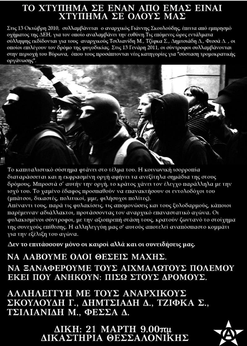 Στις 13/10/2010 συλλαμβάνεται ο σύντροφός μας Γ. Σκουλούδης τη στιγμή που πυρπολεί όχημα της ΔΕΗ. Από τότε βρίσκεται έγκλειστος στις φυλακές ανηλίκων Αυλώνα, έχοντας αναλάβει την πολιτική ευθύνη της επιλογής του.