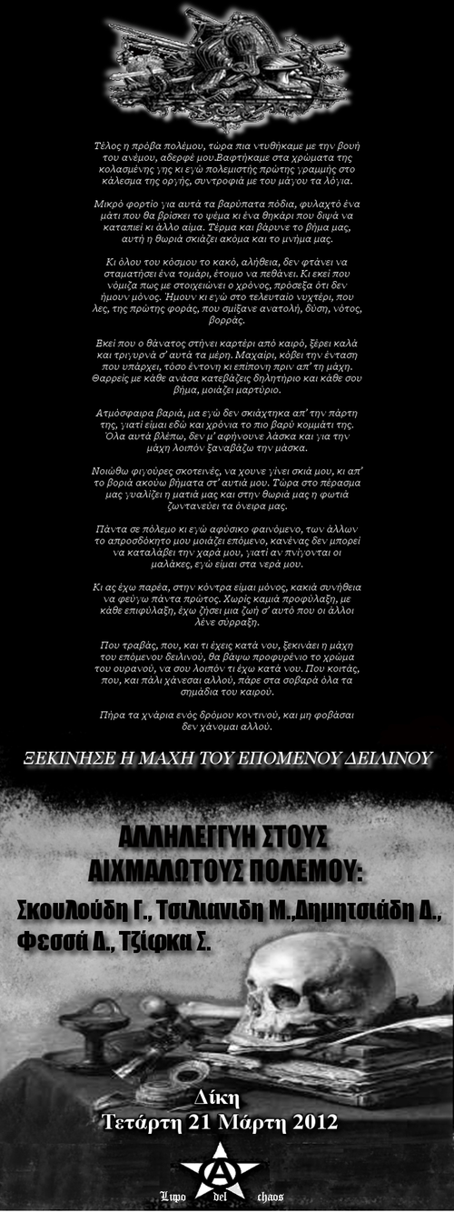 Απέναντι τους, παρά τις φυλακίσεις, τις απομονώσεις και τους ξυλοδαρμούς, κάποιοι παρέμειναν αδιάλλακτοι, προτάσσοντας τον αναρχικό επαναστατικό αγώνα. Οι φυλακισμένοι σύντροφοι, με την αξιοπρεπή στάση τους, κρατούν ζωντανό το στοίχημα της συνεχούς επίθεσης. Η αλληλεγγύη μας σ' αυτούς αποτελεί αναπόσπαστο κομμάτι για την εξέλιξη του αγώνα.