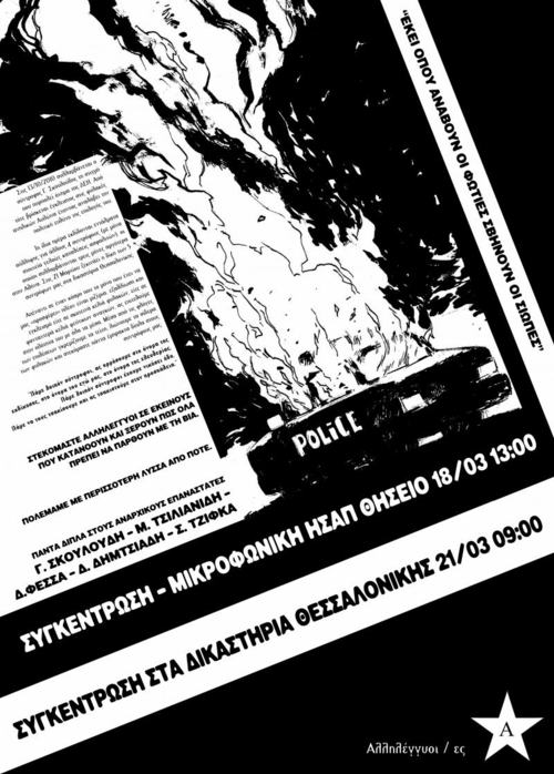 Στις 9:00 στον 3ο όροφο θα διεξαχθεί η δίκη για τον εμπρησμό του οχήματος της ΔΕΗ, Σκουλούδη, Τζίφκα, Δημτσιάδη, Φεσσά, Τσιλιανίδη.