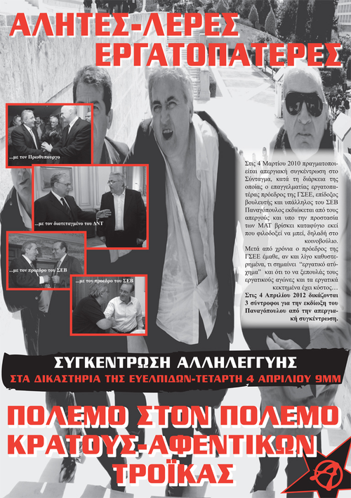 Στις 4 Απριλίου 2012 οι Ν.Μ., Δ.Β. και Κ.Π. καλούμαστε στα δικαστήρια της πρώην σχολής Ευελπίδων να δικαστούμε για την εκδίωξη του επαγγελματία εργατοπατέρα, επίδοξου βουλευτή και υπάλληλου του ΣΕΒ Παναγόπουλου από την απεργιακή συγκέντρωση που πραγματοποιήθηκε στις 5 Μαρτίου 2010 στο Σύνταγμα.