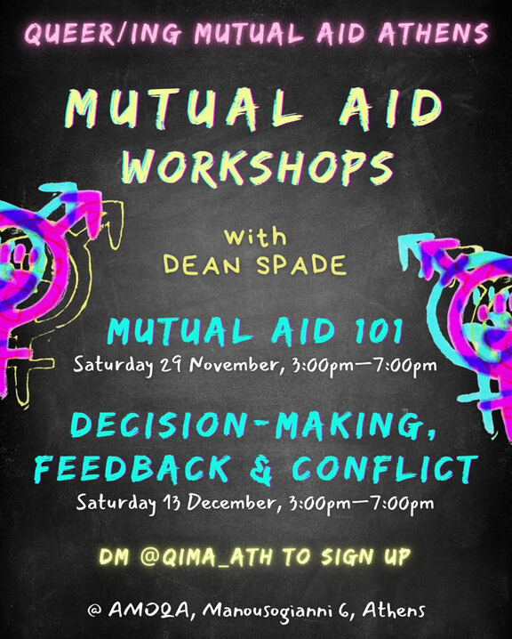 join dean spade and queer/ing mutual aid athens (qima) as we come together to continue to (un)learn and share our experiences and practices of mutual aid. you can sign up by sending a email to qima_ath@proton.me