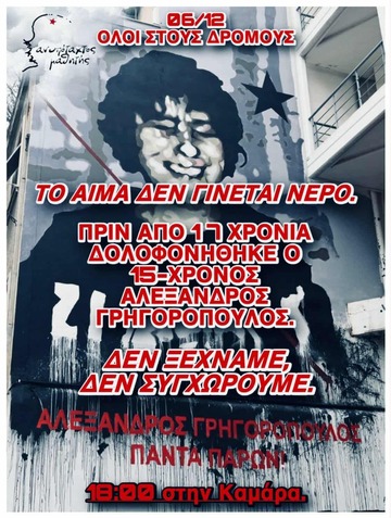 17 χρόνια συμπληρώνονται φέτος από την εν ψυχρώ δολοφονία του 15χρόνου αναρχικού μαθητή Αλέξανδρου Γρηγορόπουλου απο τον μπάτσο Κορκονέα στα Εξάρχεια. Τα γεγονότα της βραδιάς είναι γνωστά σε όλους/ες.