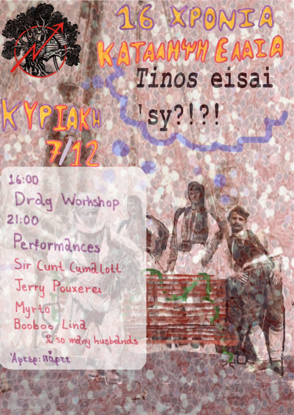 [[Στις 4μμ θα γίνει drag workshop / συζήτηση και τιπς για το ντραγκ & στις 9μμ θα ακολουθήσουν performances από τα Booboo Lina, Myrto, Jerry Pouxerei και Sir Cunt Cumalott]]
