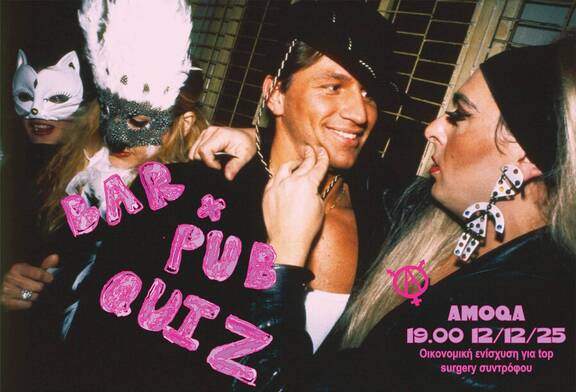 Pub Quiz βραδιά, για την οικονομική ενίσχυση top surgery ατόμου! Θα υπάρχει μπαρ με αλκοολούχα και μη, αφεψήματα! Αστείες ερωτήσεις ! Μουσική! Και δωροσακουλες!! (Φέρτε τα πορτοφόλια και την καλή σας διάθεση!)