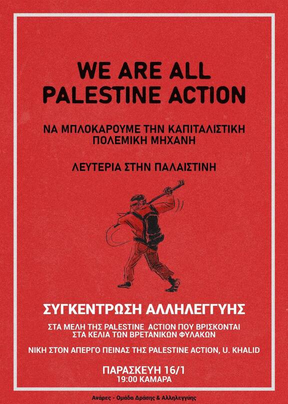 Συγκέντρωση αλληλεγγύης στην Palestine Action και στον απεργό πείνας Umer Khalid, Καμάρα, Παρασκευή 16/1,19:00