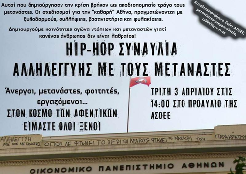 Αυτές τις μέρες το καθεστώς στοχοποιεί τους μετανάστες για την κρίση, θέτοντας κάποιους ανθρώπους σε "κατάσταση εξαίρεσης". Αυτές τις μέρες έχουν εξαπολύονται καθημερινά πογκρόμ κατά των μεταναστών στο κέντρο της Αθήνας και κατά των μικροπωλητών γύρω από την ΑΣΟΕΕ και τη Νομική.
