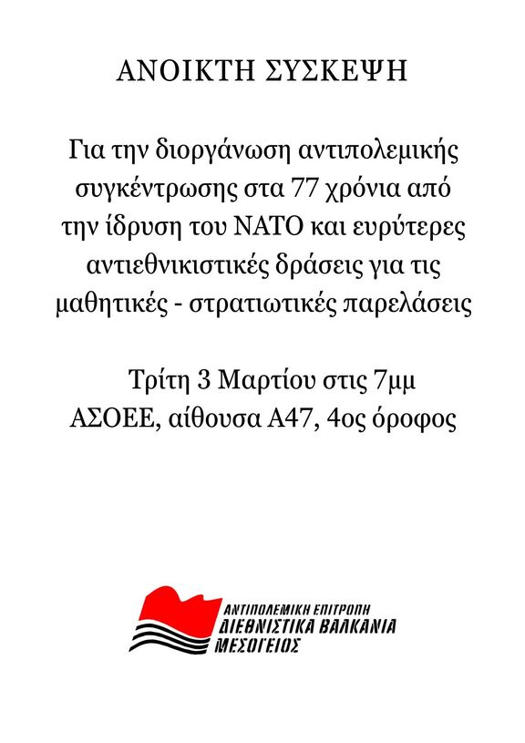 Ανοιχτή σύσκεψη για αντιπολεμική συγκέντρωση στα 77 χρόνια από την ίδρυση του ΝΑΤΟ και ευρύτερες αντιεθνικιστικές δράσεις