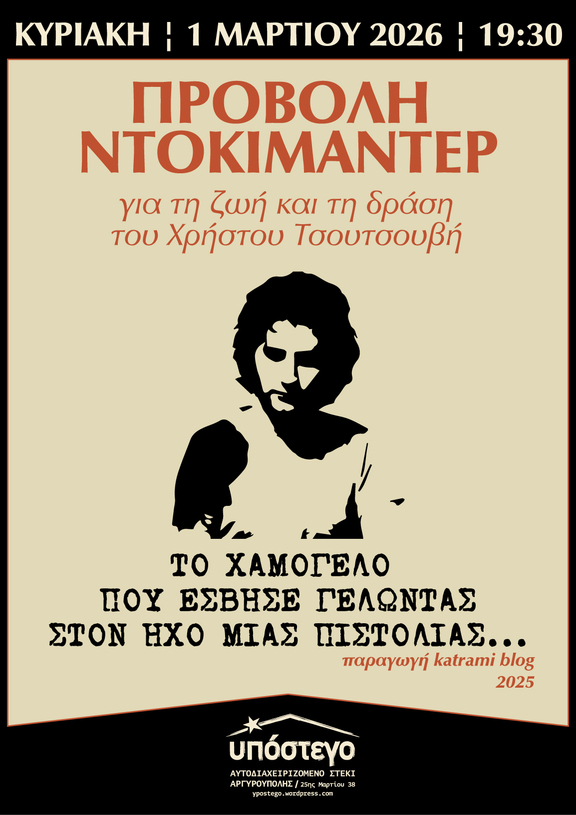 Κυριακή 1 Μαρτίου στις 19:30 - Προβολή του ντοκιμαντέρ «Το χαμόγελο που έσβησε γελώντας στον ήχο μιας πιστολιάς» το οποίο αναφέρεται στη ζωή και τη δράση του αναρχικού Χρήστου Τσουτσουβή ο οποίος έπεσε νεκρός στις 15 Μαΐου 1985 στη «μάχη του Γκύζη». Το ντοκιμαντέρ από το blog katrami είναι παραγωγής 2025.