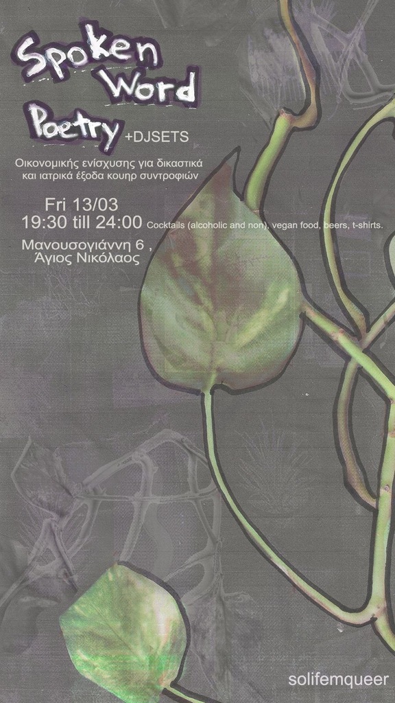 Ελάτε να πούμε και να ακούσουμε ποιήματα, να πιούμε (αλκοολούχα ή μη ποτά) και να φάμε (vegan φαγητά) την Παρασκευή 13 Μαρτίου, Μανουσογιάννη 6!