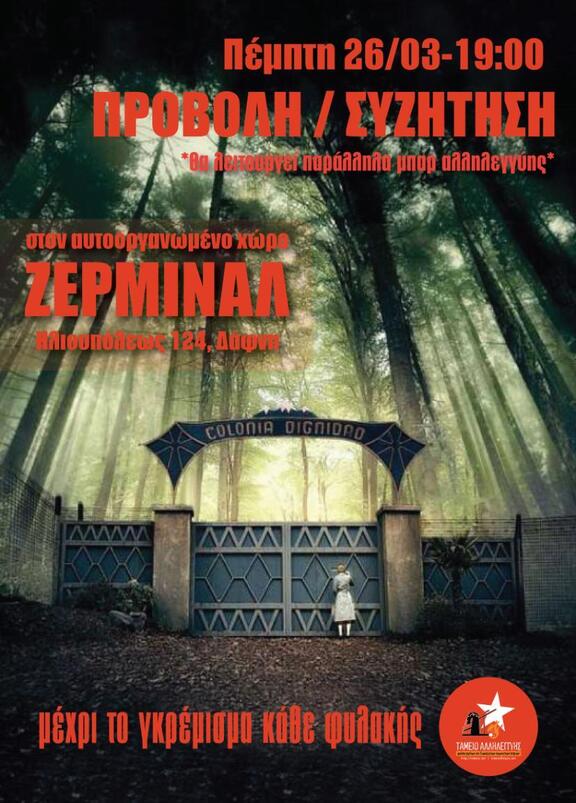 Πέμπτη 26/3, στις 19:00 το Ταμείο Αλληλεγγύης στους φυλακισμένους και διωκόμενους αγωνιστές σας καλεί στον αυτοοργανωμένο χώρο Ζερμινάλ στα Νότια (Ηλιουπολεως 124, Δαφνη) στην προβολή της ταινίας Colonia (2015) σε σκηνοθεσία Φλόριαν Γκάλενμπεργκερ και σενάριο Τόρστεν Βέντσελ.